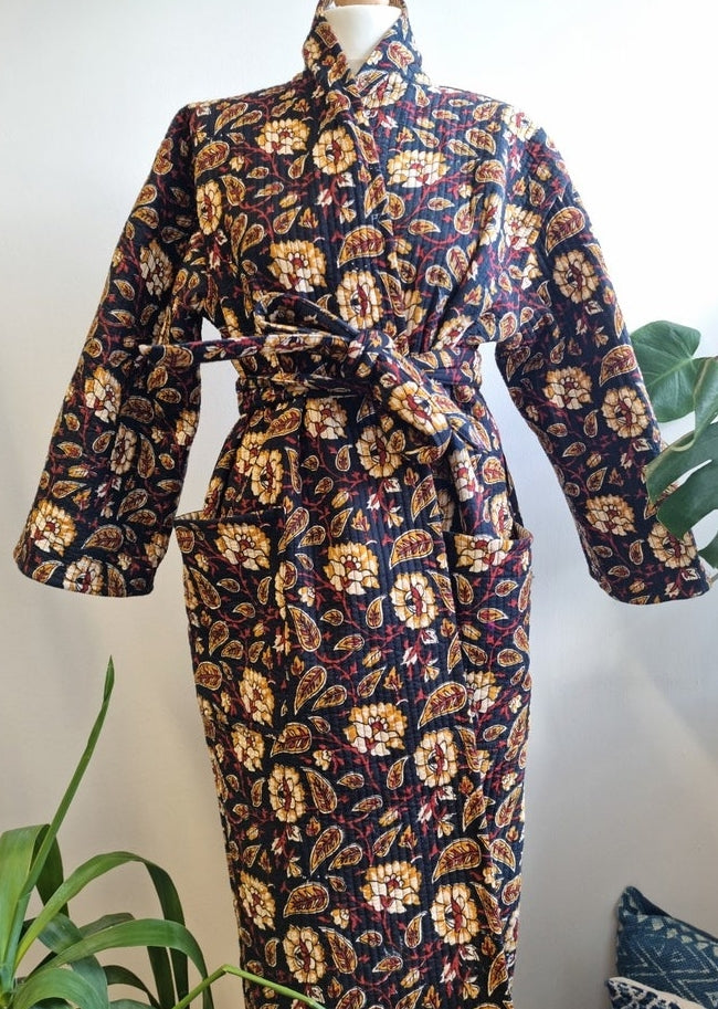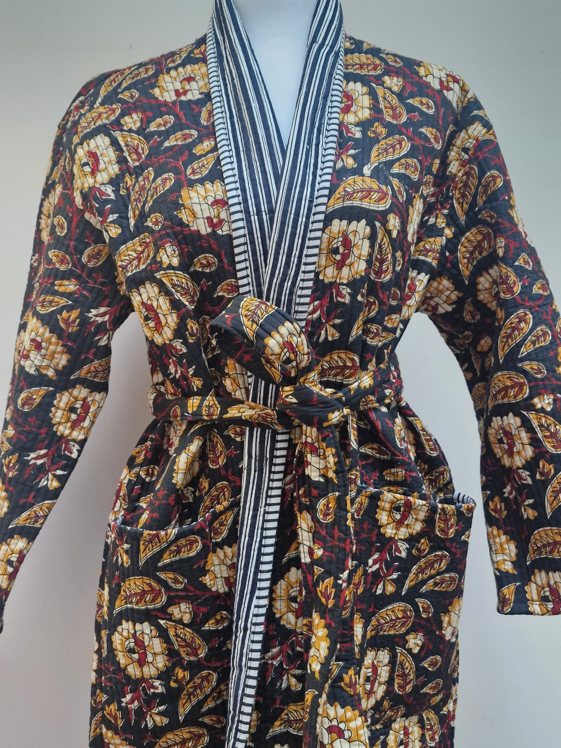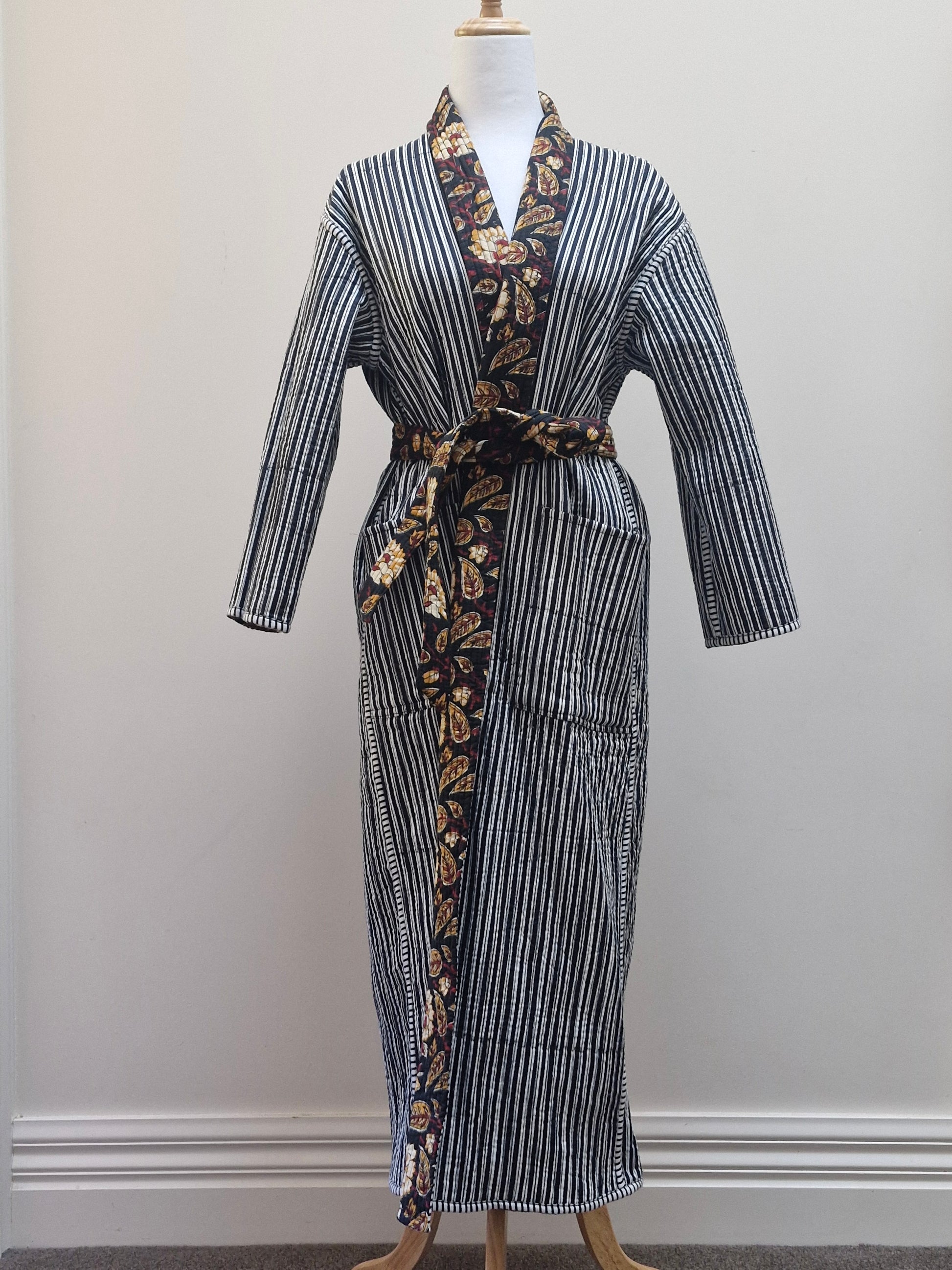 100% Quilted Cotton Reversible Robe in Black Floral with contrast Black and White stripe.