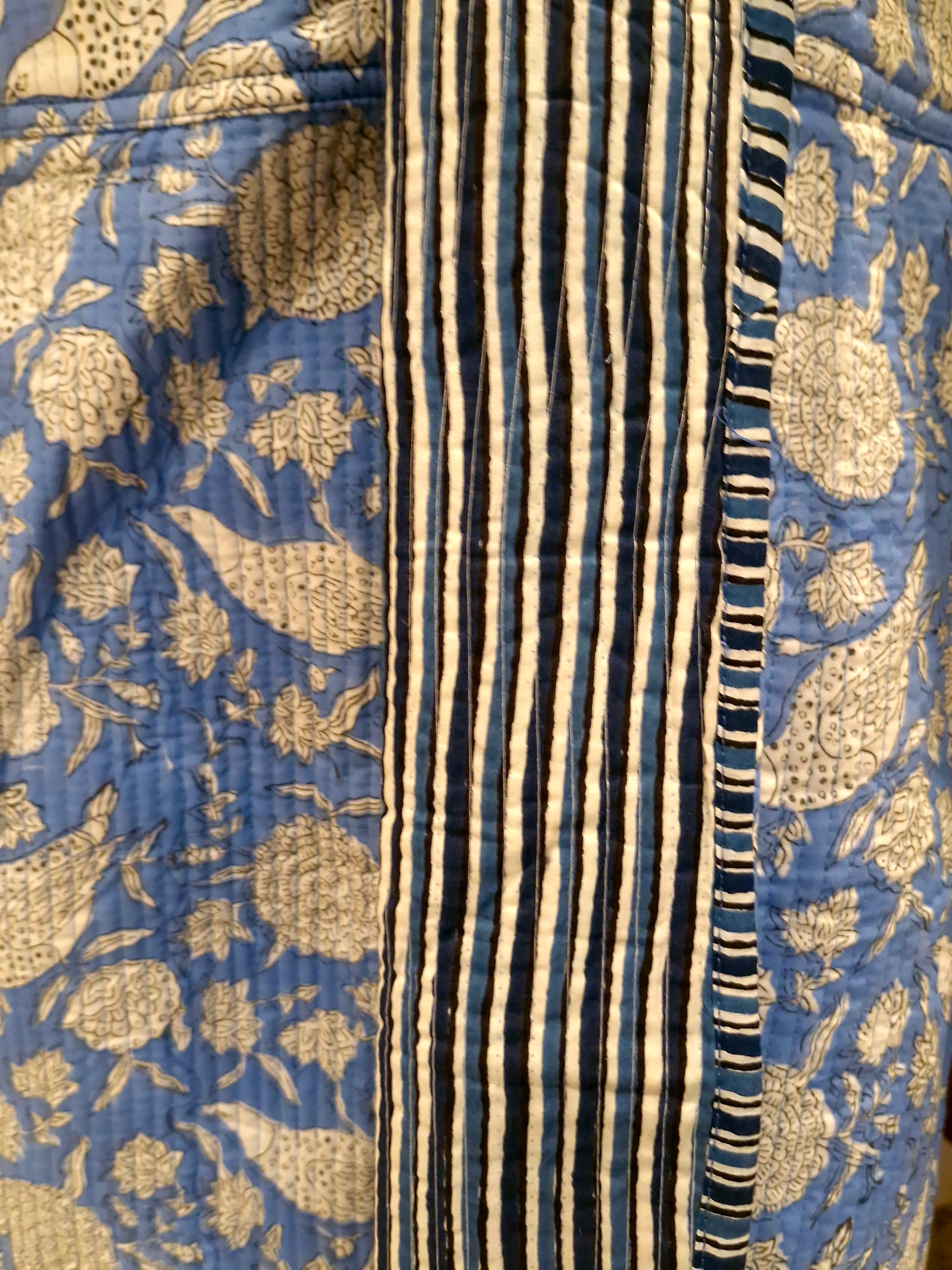 100% Quilted Cotton Reversible Robe in light blue with white bird and flower print. Reverse side in classic blue tone stripes.